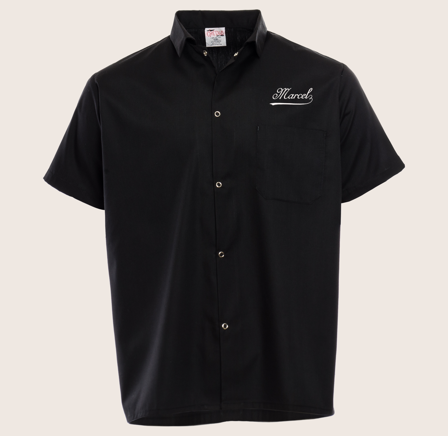 Marcel black cook shirt with embroidered logo.